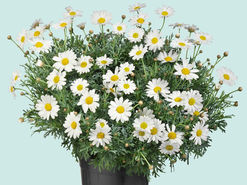 Met een beetje aandacht kun je verrassend lang genieten van een struikmargriet. Goede potgrond is de basis. Water geef je pas wanneer de grond wat droog aanvoelt. Hydrokorrels onderin de pot helpen om vocht vast te houden en later weer af te geven. Door regelmatig uitgebloeide bloemen en vergeelde blaadjes weg te halen, blijft de plant mooi vol. Om de bloei op gang te houden, mag ze om de twee weken wat vloeibare voeding krijgen.