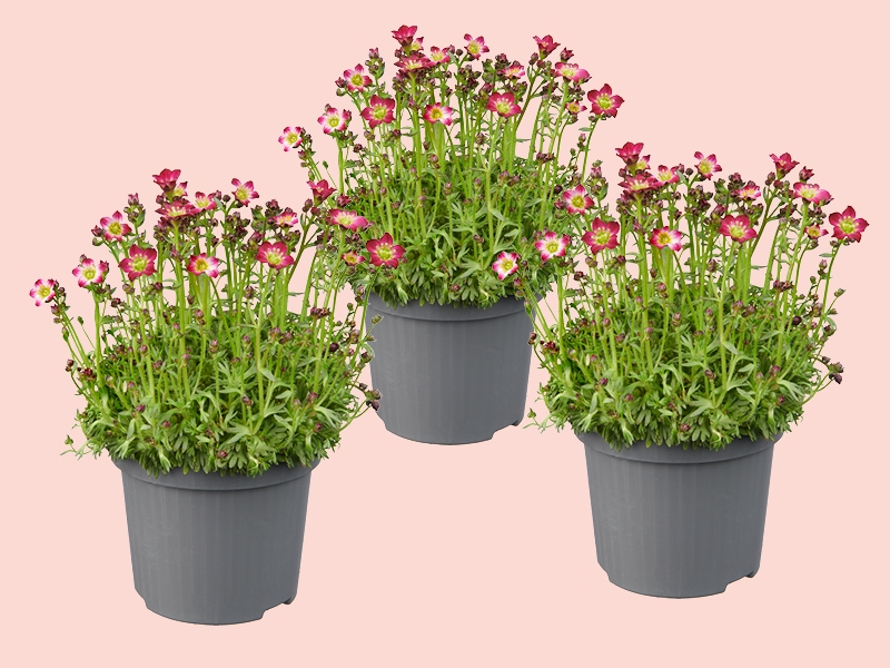 Saxifraga vormt dichte matjes van kleine rozetjes met frisgroene of soms grijzige blaadjes. In het voorjaar verschijnen er slanke stengeltjes met daarop lieve bloemetjes in wit, roze of rood – afhankelijk van de soort. Ze wiegen zachtjes in de wind en geven een speels, bijna sprookjesachtig effect. De groei is laag en bodembedekkend, dus ideaal voor het opvullen van open plekjes of als bloeiende rand.